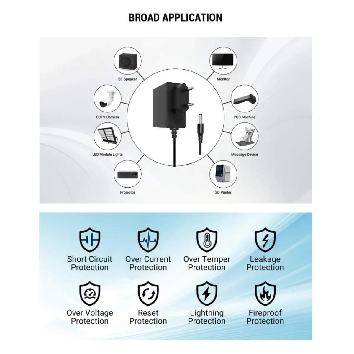 2. व्यापक अनुकूलता: यसको मानक 12V आउटपुट र सामान्य DC ब्यारेल प्लग (सामान्यतया 5.5*2.1mm) संग, यो विभिन्न उपकरणहरू जस्तै राउटरहरू, नेटवर्क स्विचहरू, सुरक्षा क्यामेराहरू, सेट-टप बक्सहरू, र गेमिङ कन्सोलहरूको लागि उपयुक्त छ।
