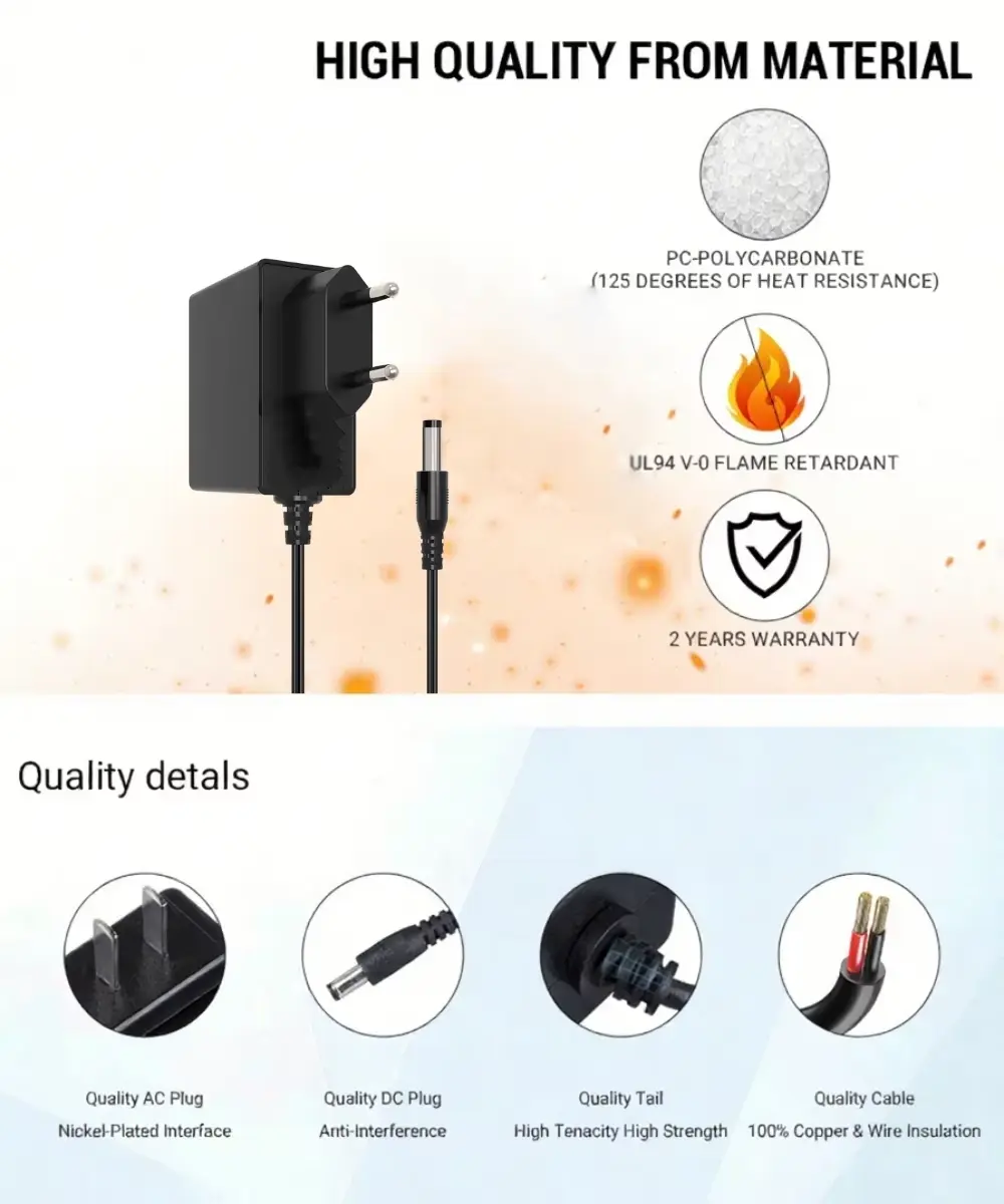 24W पावर एडाप्टर श्रृङ्खलाले कडा अन्तर्राष्ट्रिय मापदण्डहरू पूरा गर्दछ र CE/FCC/UL/RCM/SAA/UKCE/KC/BIS/PSE प्रमाणपत्र सहित, सुरक्षा र वातावरणीय अनुपालन सुनिश्चित गर्दै विश्वव्यापी प्रमाणीकरणहरूको गर्व गर्दछ। यसको युरोपेली प्लग डिजाइनले सुरक्षित जडानहरूको लागि अनुमति दिन्छ, यसलाई विभिन्न सेटिङहरूमा प्रयोग गर्न सजिलो बनाउँछ।