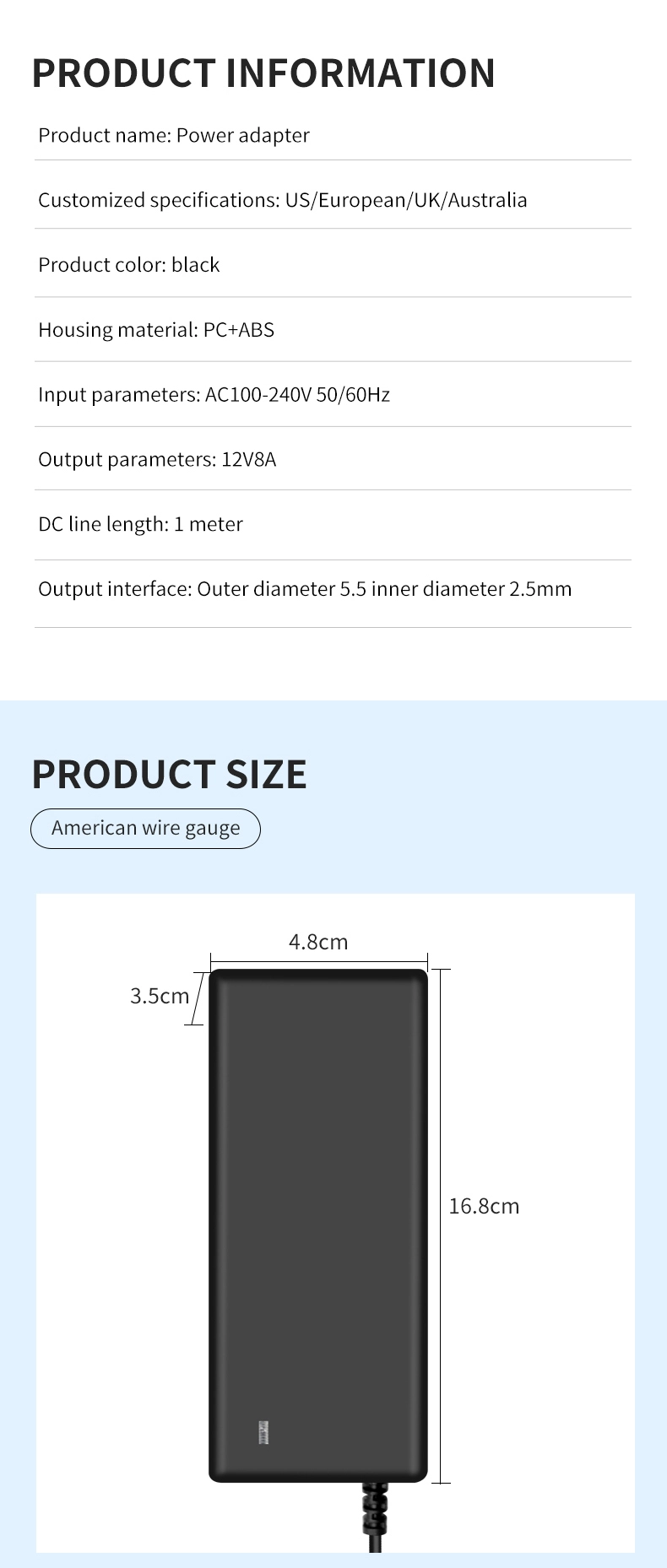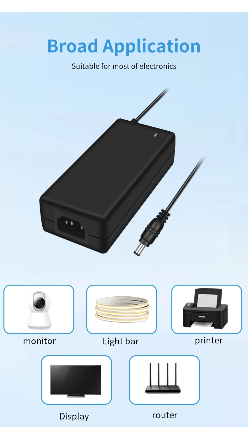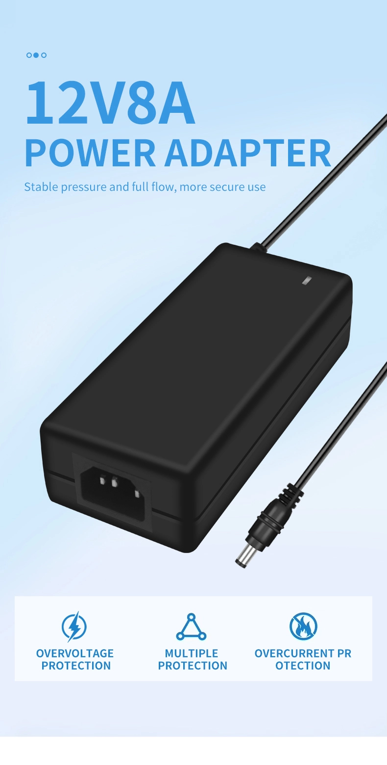 96W को मूल्याङ्कन गरिएको पावरको साथ, 96W पावर एडाप्टरको आउटपुट वर्तमान 8A को शिखरमा स्थिर हुन्छ, र भोल्टेज शुद्धता ± 5% भित्र नियन्त्रण गरिन्छ (नो-लोड भोल्टेज: 12.1V; पूर्ण-लोड भोल्टेज: 11.8V)। यसले धेरै यन्त्रहरू (जस्तै, 2 समानान्तर 48W यन्त्रहरू) को एकै साथ पावर आपूर्ति आवश्यकताहरू पूरा गर्न सक्छ। शुद्ध तामा कोर आउटपुट केबलले ≤0.3V को भोल्टेज ड्रप सुनिश्चित गर्दछ, उच्च-वर्तमान प्रसारणको समयमा अपरिचित कार्यसम्पादन कायम राख्छ।