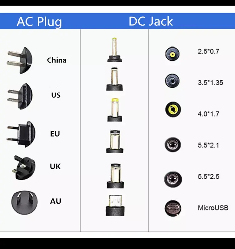 कनेक्टर प्रकार: मानक DC ब्यारेल कनेक्टर (सामान्य आकारहरू 5.5mm × 2.1mm वा 5.5mm × 2.5mm, उपकरण आवश्यकताहरूको आधारमा अनुकूलन गर्न सकिन्छ)।
