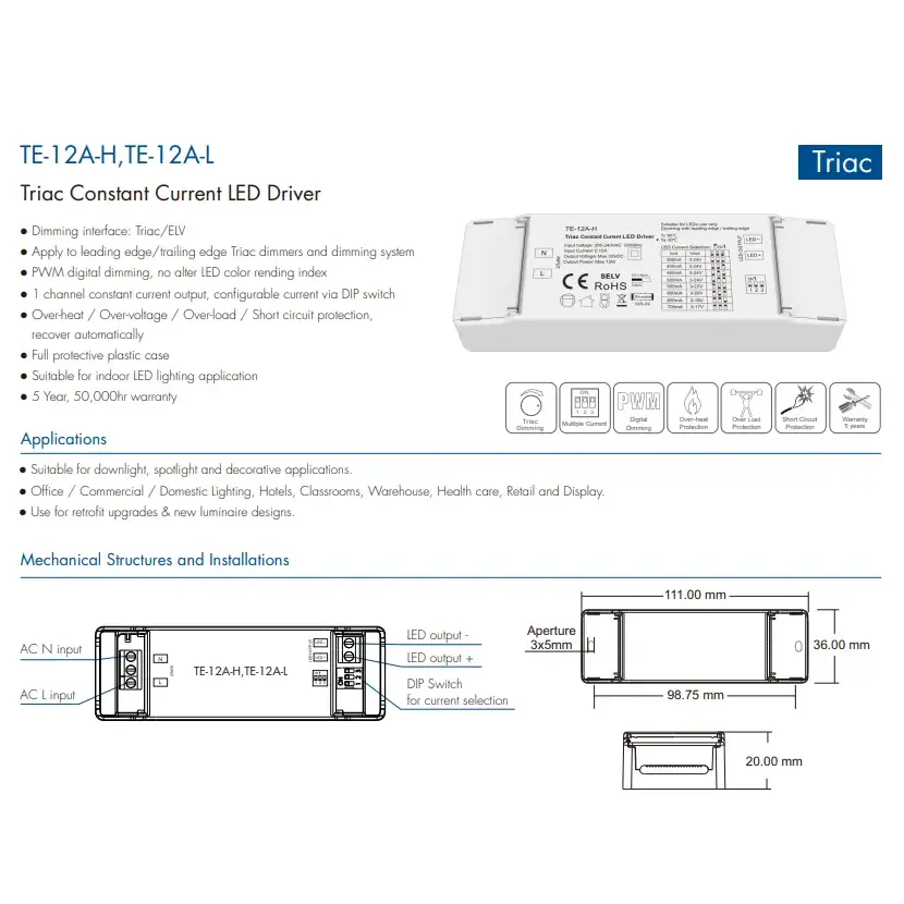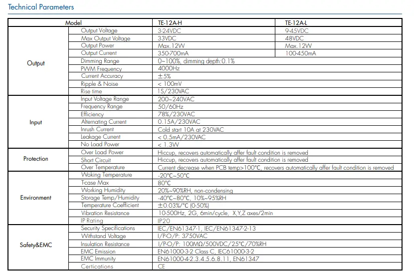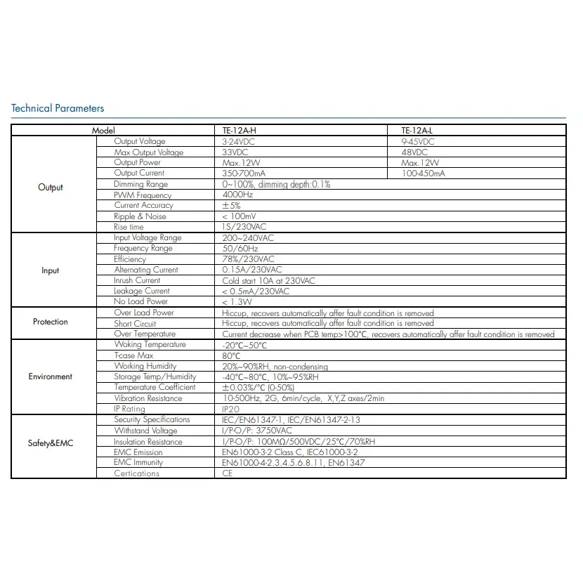इनपुट भोल्टेज: 200-240VAC 50-60Hz हालको इनपुट: 0.15A आउटपुट पावर: १२ वाट अधिकतम आउटपुट भोल्टेज: 9 ~ 42V वारेन्टी: २ वर्ष प्रमाणपत्र: CE/Rohs