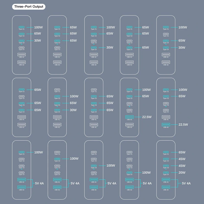 आउटपुट USB C1/C2/C3/C4: 5V/3A 9V/3A 12V/3A 15V/3A 20V/5A (100W अधिकतम) USB A1/A2: 5V/3A 9V/2A 12V/1.5A (18W अधिकतम) |