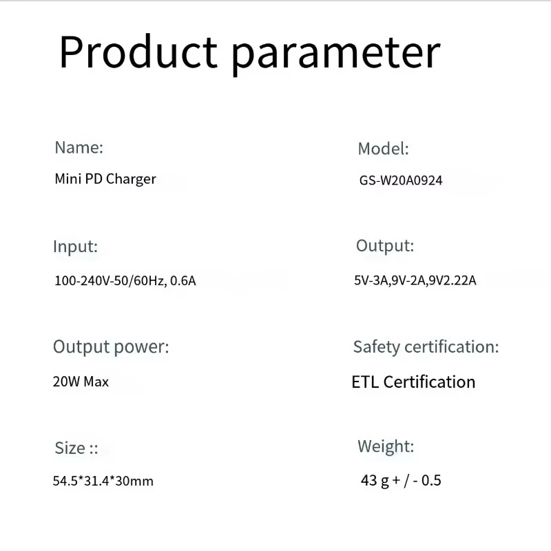 20W जापान संस्करण प्लग PD चार्जर विशिष्टता: