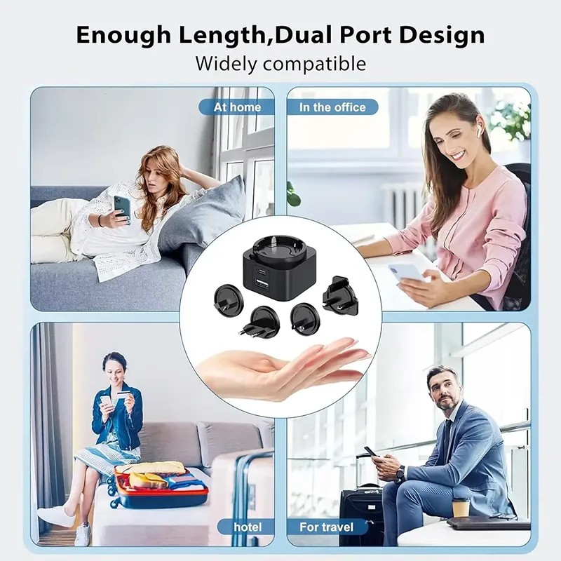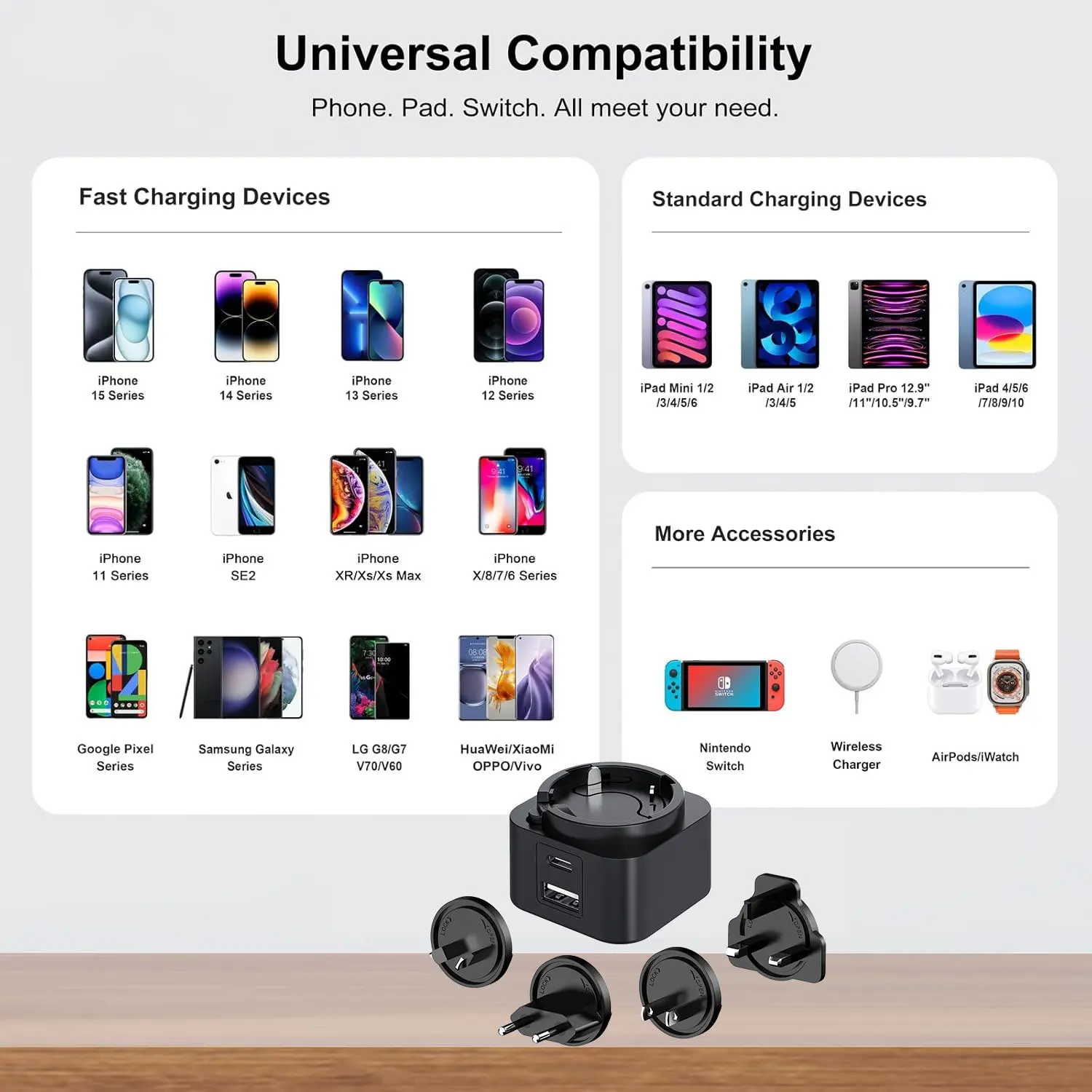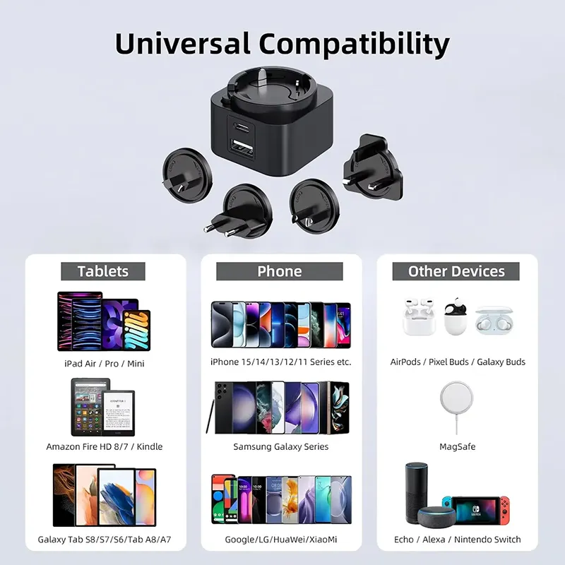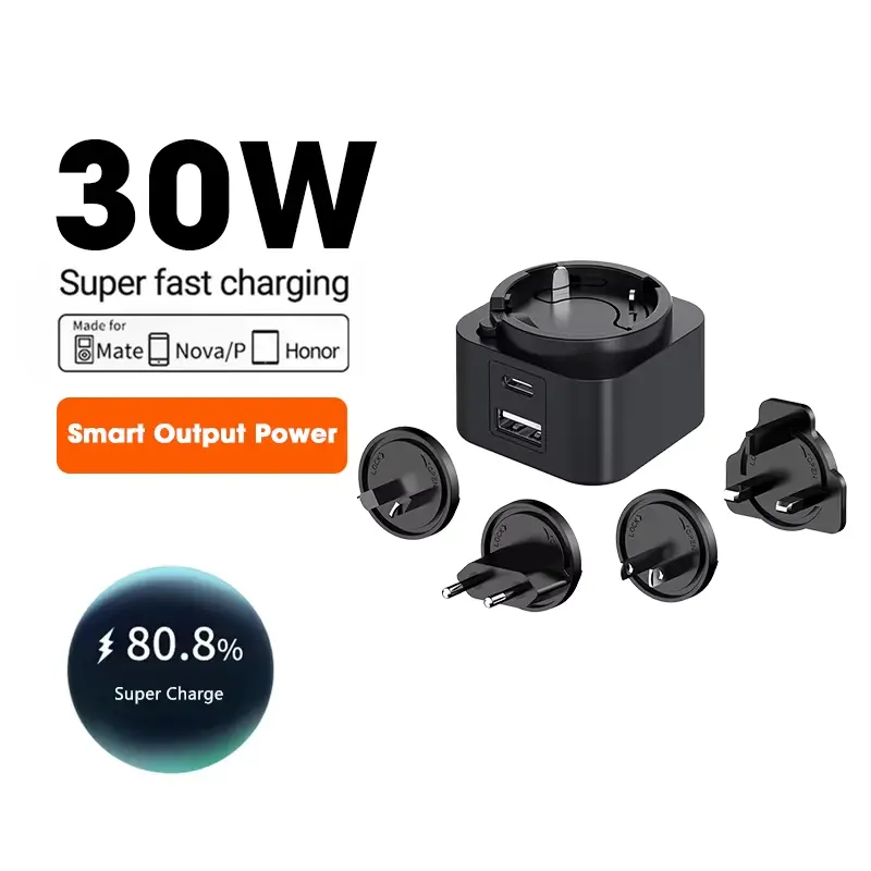 बहुमुखी प्रतिभा कुञ्जी हो। डुअल-पोर्ट डिजाइन (USB-C/USB-A) ले तपाईंलाई दुईवटा यन्त्रहरू एकैसाथ चार्ज गर्न अनुमति दिन्छ। 30W इन्टरचेन्जेबल प्लग PD चार्जरले विनिमेय प्लगहरूको सेट (US/EU/UK/AU) को सुविधा दिन्छ, यसलाई विश्वभरि तपाईंको उत्तम यात्रा साथी बनाउँछ। तपाईं स्मार्टफोन, ट्याब्लेट, वा ल्यापटप चार्ज गर्दै हुनुहुन्छ भने, विश्वव्यापी अनुकूलताले शीर्ष-स्तरीय कार्यसम्पादन सुनिश्चित गर्दछ।