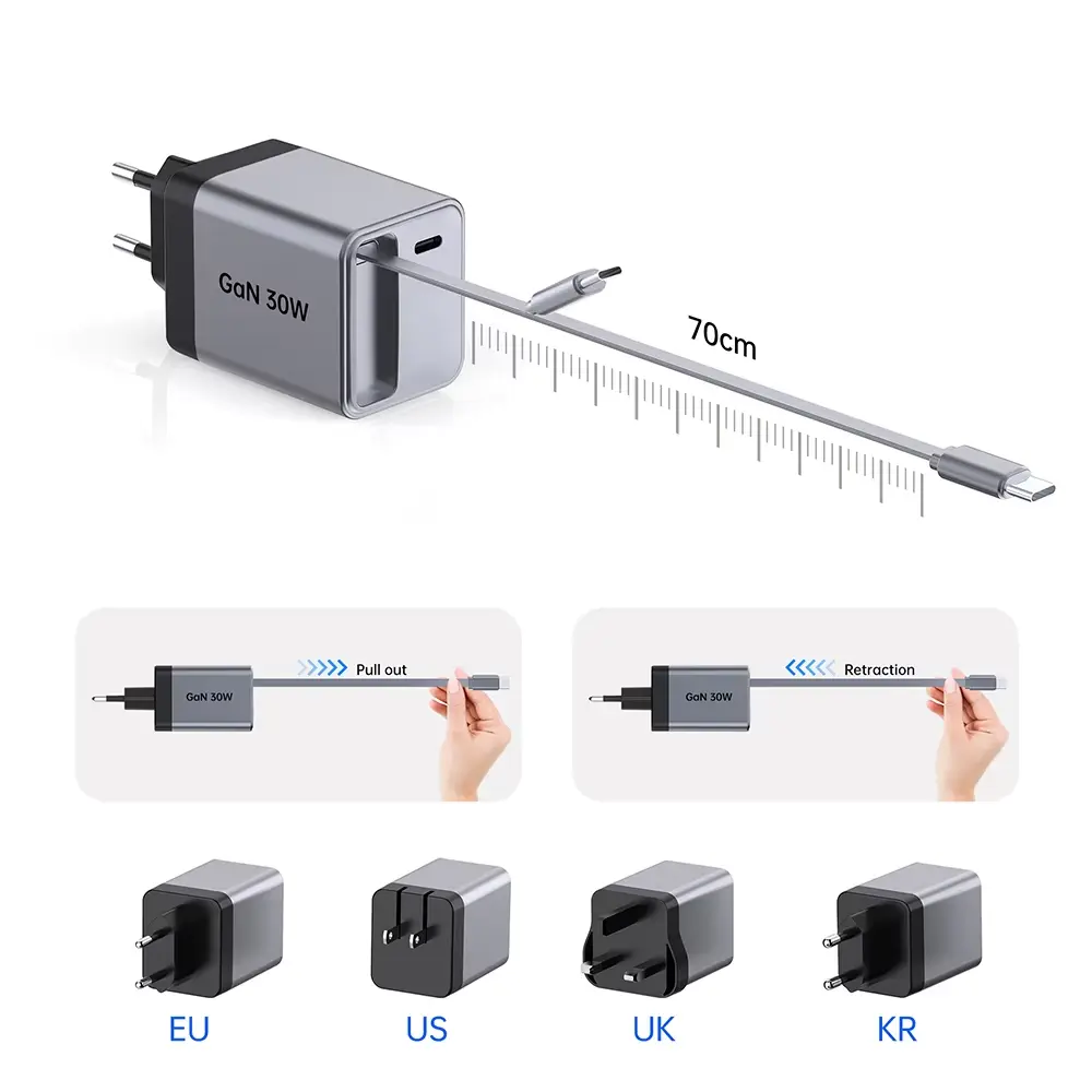 30W द्रुत चार्जर रिट्र्याक्टेबल टाइप सी केबल सुविधाहरू सहित: