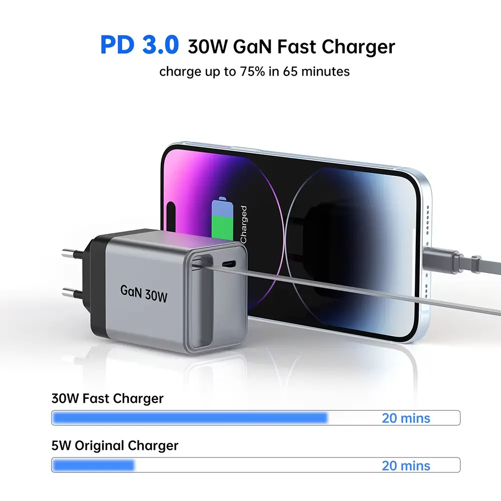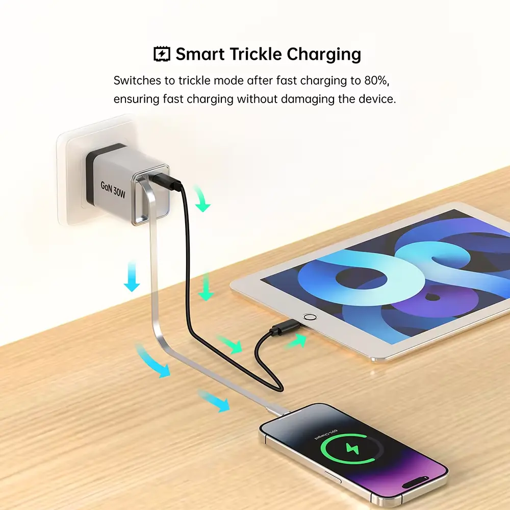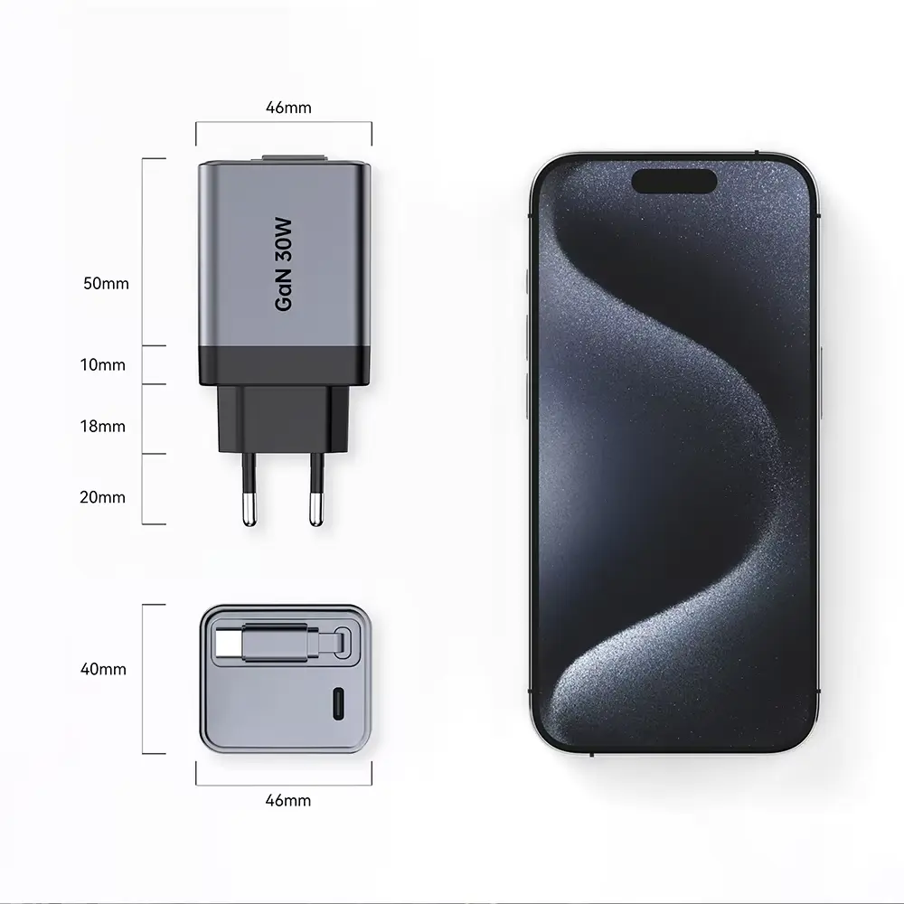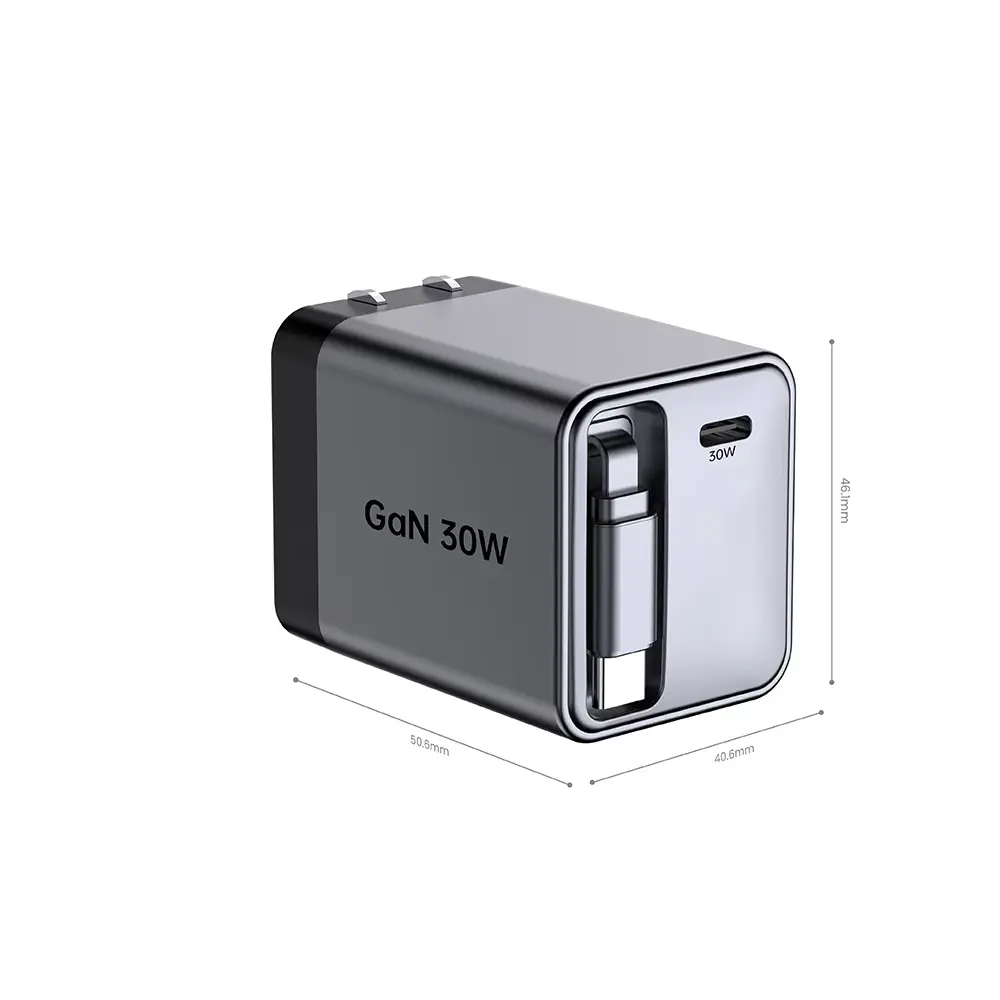 रिट्र्याक्टेबल टाइप सी केबलको अल्ट्रा-हल्का, पकेट आकारको डिजाइन भएको ३०W क्विक चार्जरले यसलाई वरिपरि बोक्न सजिलो बनाउँछ। यो घर, अफिस वा यात्राको लागि उत्तम विकल्प हो।