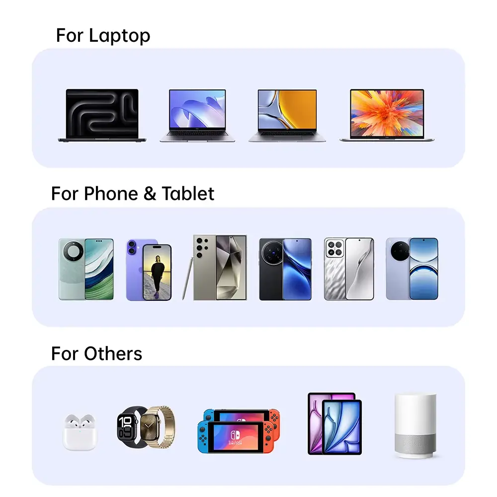USB-C यन्त्रहरूसँग उपयुक्त, मोबाइल फोनहरू, हेडफोनहरू, र गेमिङ सामानहरू सहित। सुरक्षित र प्रभावकारी चार्जिङका लागि यन्त्र आवश्यकताहरू स्वचालित रूपमा पत्ता लगाउँदछ। 4. यात्रा-तयार पोर्टेबिलिटी