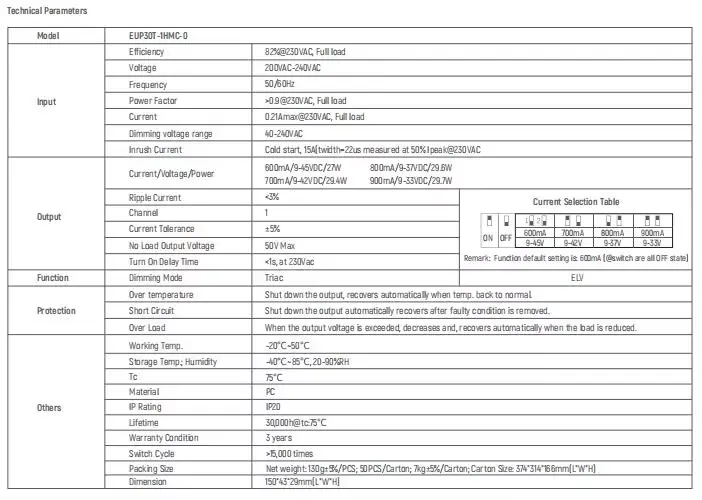 एक पेशेवर निर्माता र चीन मा नेतृत्व चालक को आपूर्तिकर्ता को रूप मा, हाम्रो 30W Triac dimming LED Driver Constant Current एक पावर रूपान्तरण यन्त्र हो जुन विशेष गरी मध्यम देखि उच्च शक्ति LED प्रकाश प्रणाली को लागी डिजाइन गरिएको हो। यसले मूल्याङ्कन गरिएको वर्तमानमा एलईडी मोतीहरूको स्थिर सञ्चालन सुनिश्चित गर्न, प्रभावकारी रूपमा बत्तीको आयु विस्तार गर्न र प्रकाश दक्षताको स्थिरता सुधार गर्न उन्नत स्थिर वर्तमान नियन्त्रण प्रविधि अपनाउछ। स्थिर वर्तमान डिमिङ एलईडी ड्राइभर व्यावसायिक प्रकाश, औद्योगिक प्रकाश, बाहिरी फ्लडलाइटहरू, र बोट वृद्धि बत्तीहरू जस्ता उच्च माग प्रकाश परिदृश्यहरूको लागि उपयुक्त छ।