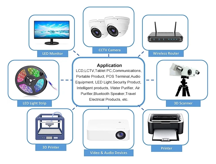 * 48W श्रृंखलाका लागि थप एकाइहरू: 5V/9V/12V/15V/19V/24V/36V/48V उपलब्ध * सुरक्षा: OCP/OVP/OTP, SCP, स्वचालित ओभरलोड कट-अफ, ओभर भोल्टेज कट-अफ, स्वचालित थर्मल कट-अफ। * व्यापक अनुकूलताहरू: एलईडी स्ट्रिप लाइटहरू, थ्रीडी प्रिन्टर, ह्याम रेडियो ट्रान्सीभर, सीसीटीभी क्यामेरा, कार सबवुफर एम्प, अडियो एम्पलीफायर, वायरलेस राउटर, एडीएसएल बिरालो, ह्युमिडिफायर, हब, किबोर्ड, बीटी स्पिकर, मोनिटर, वेबक्याम, डीभीआर, अडियो / भिडियो आपूर्ति