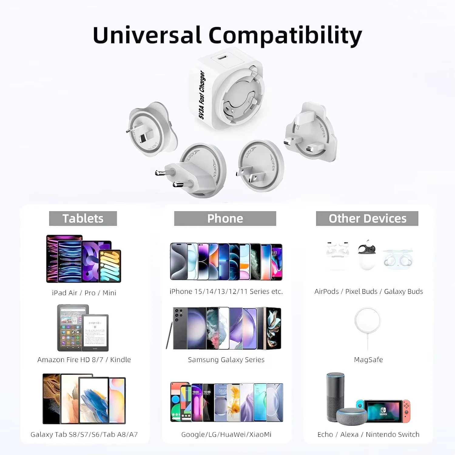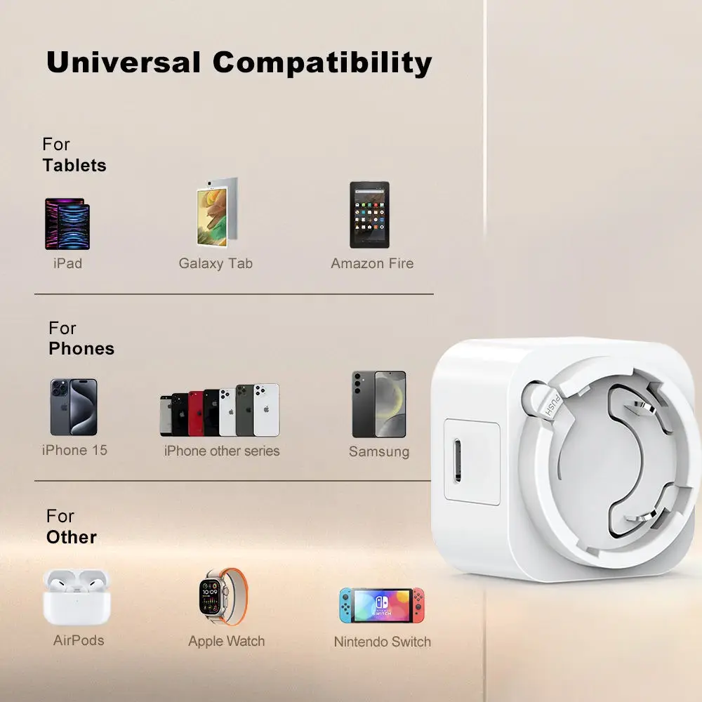 स्मार्टफोनहरू, ट्याब्लेटहरू, पोर्टेबल स्पिकरहरू र अन्य इलेक्ट्रोनिक्सहरू पावर गर्नको लागि आदर्श, यो एडाप्टरले गति, सुरक्षा, र विश्वव्यापी बहुमुखी प्रतिभालाई एक कम्प्याक्ट समाधानमा संयोजन गर्दछ।
